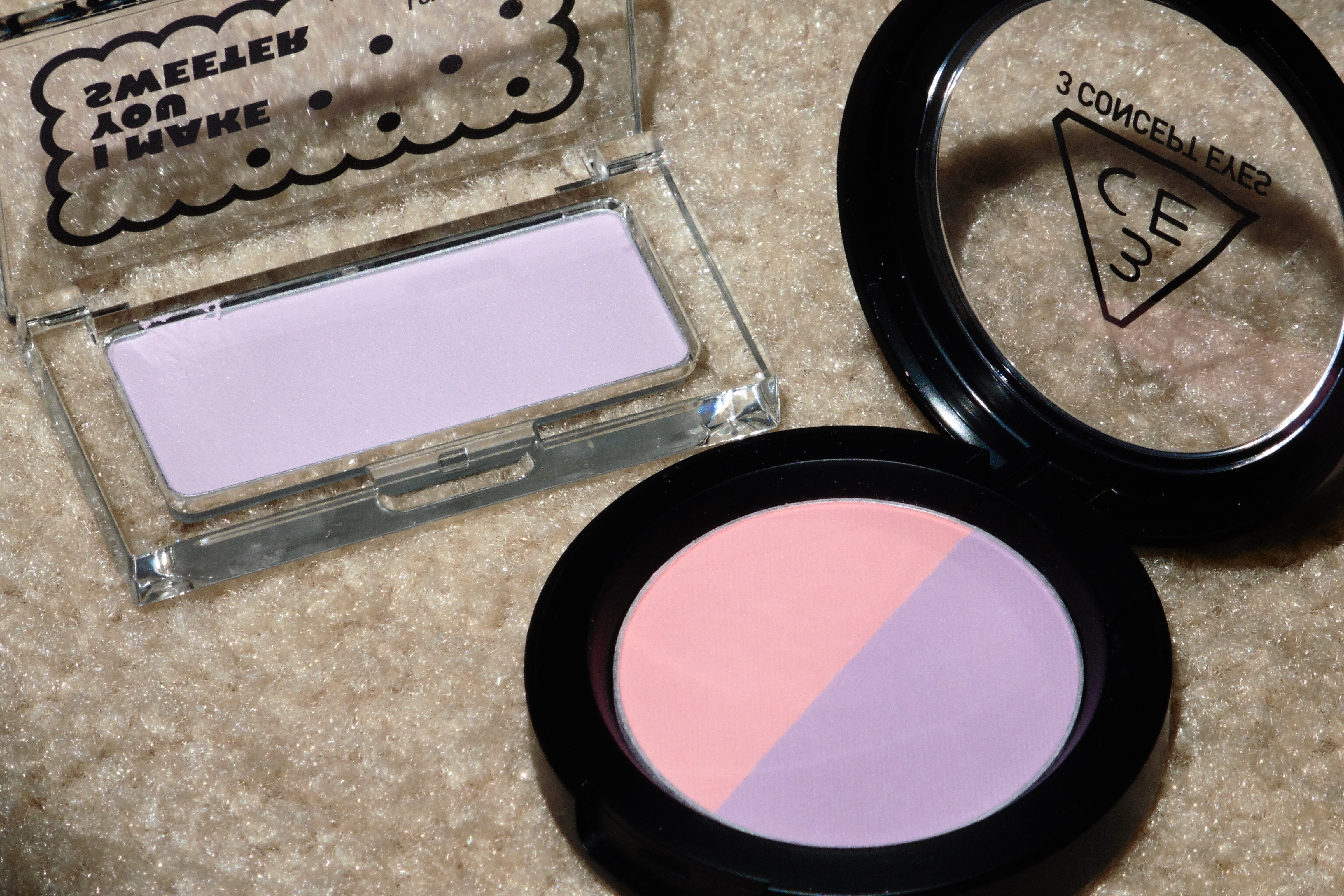 Last of all are two blushes that I was drawn to because they’re purple, my favorite color. The one on the left is from The Face Shop in the shade 03 Purple Fantasy, a light purple. The texture is soft and powdery and the finish is satiny. The one on the right is 3CE’s Duo Color Face Blush in Creme De Violette, comprised of matte pastel pink and lavender. Check out Stylenanda’s gorgeous swatch and model photos here; Creme De Violette is about 2/3rds of the page down. The lavender is deeper than The Face Shop blush. Although both blushes are cool-toned, they look cooler in my photo than they really are.