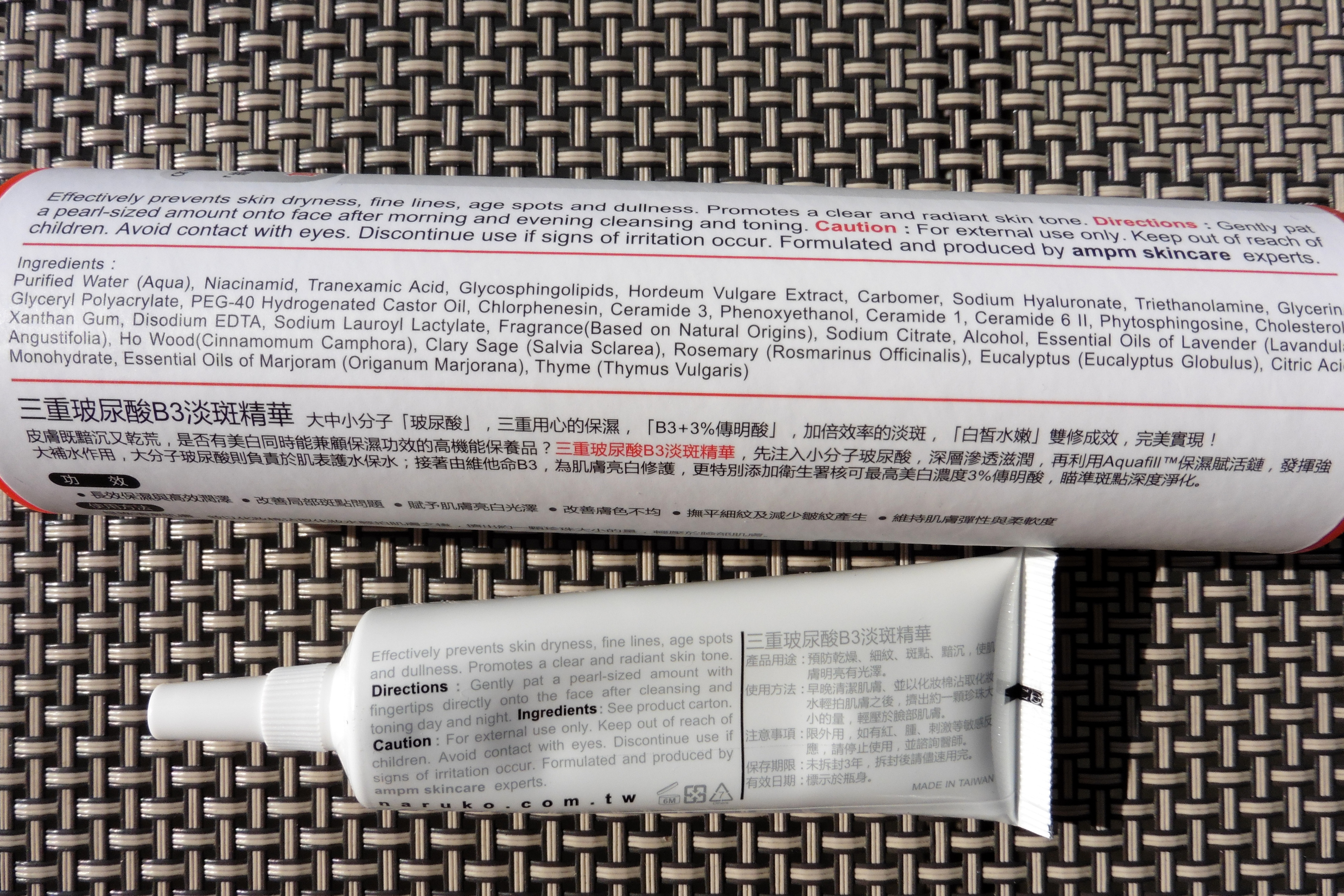 Naruko AMPM Super Triple HA+B3 Brightening Complex ($29 for 1.05 fl. oz.) is a serum whose star ingredients are hyaluronic acid (3 differently sized HA molecules!), vitamin B3 (aka niacinamide), and 3% tranexamic acid (the highest concentration approved by the Taiwan Department of Health for skin brightening).