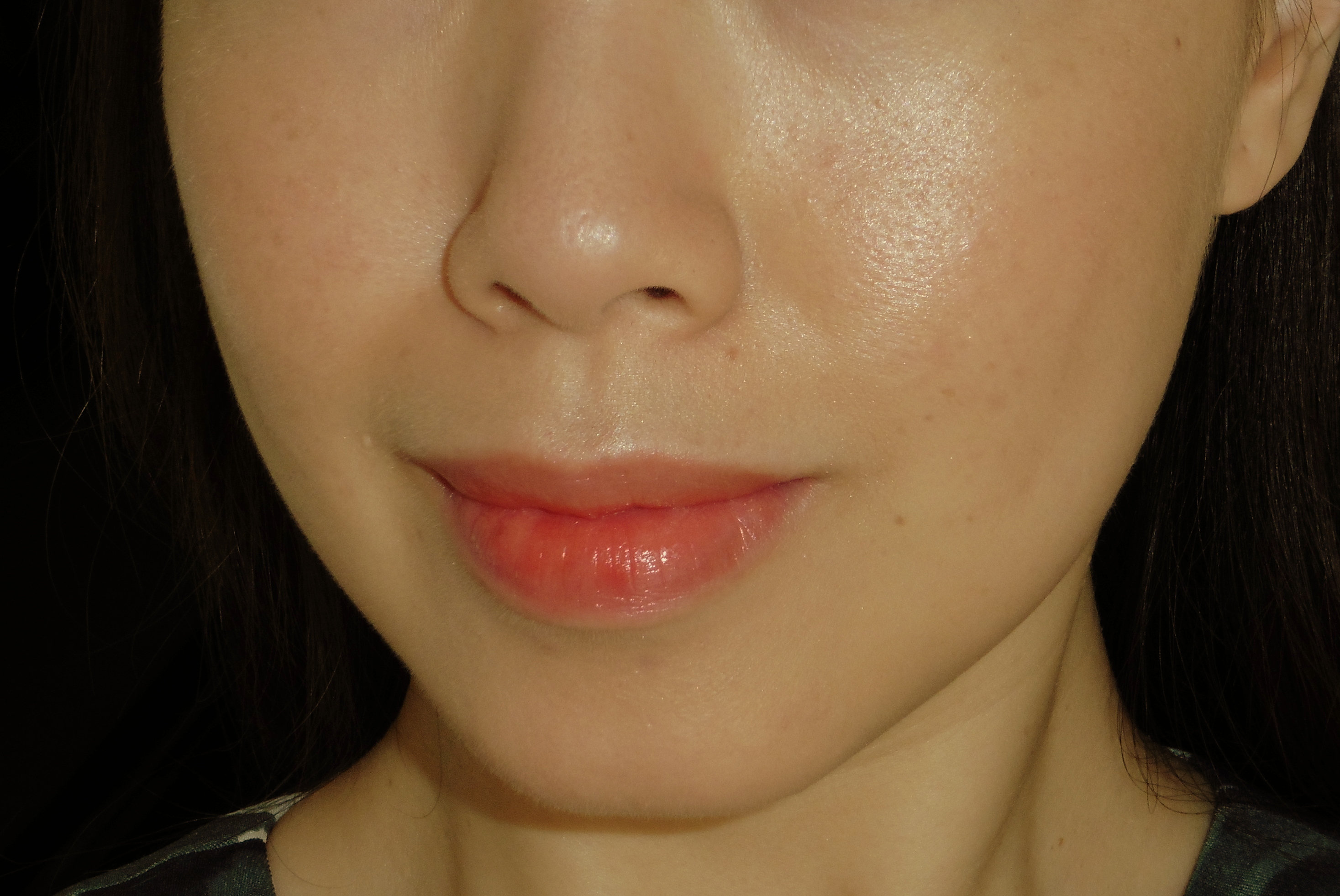 After applying my usual makeup (except for highlighting powder), I swirled a clean finger onto the stick and patted the volumer onto the various parts of my face where I wanted a glow: cheeks, chin, nose bridge, cupid’s bow. The shiny effect was visible in person although pretty hard to capture on camera without flash.
