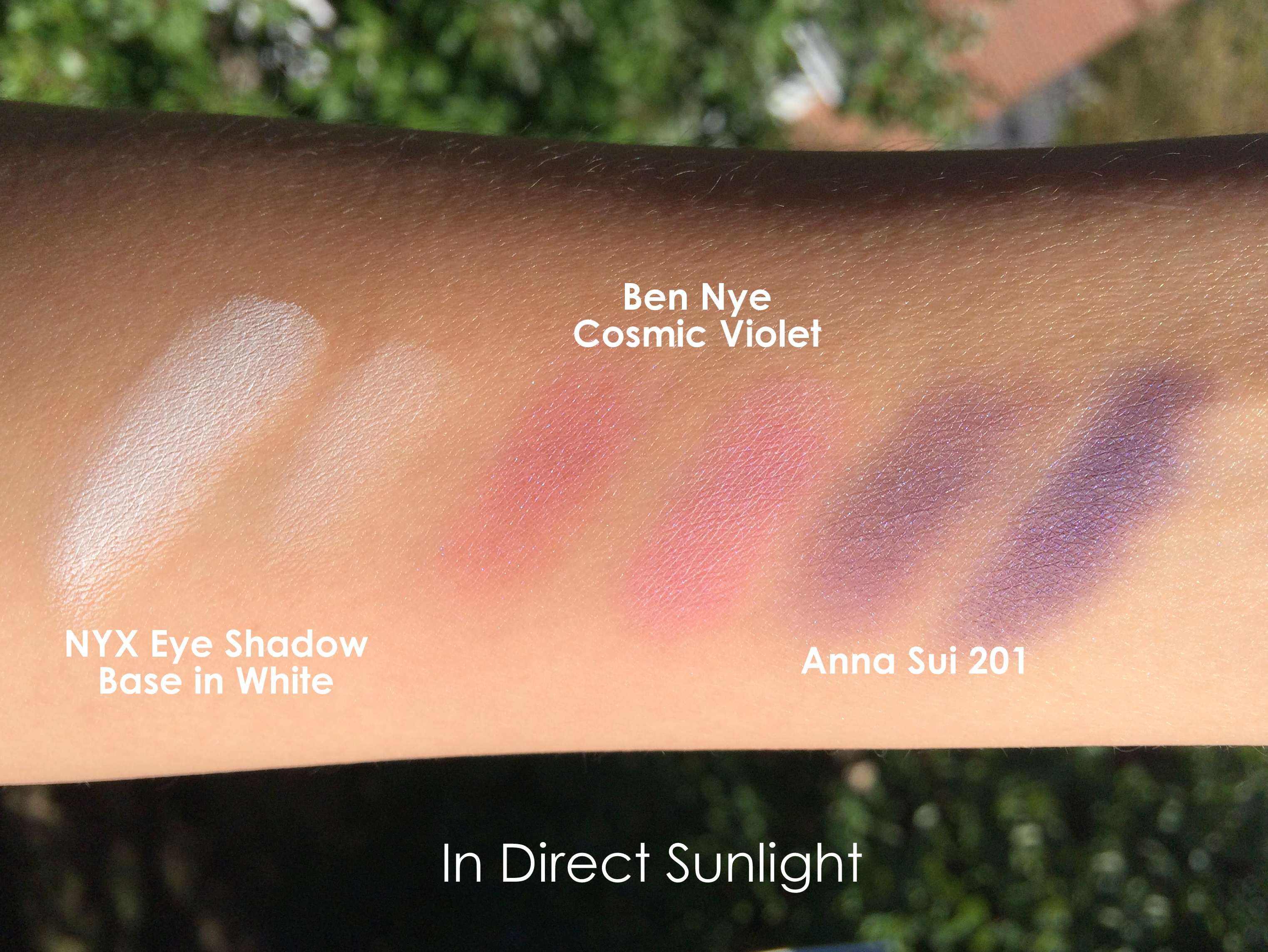 03 Ben Nye LU-17 Cosmic Violet Anna Sui Eyeshadow 201 NYX White Eye Shadow Base Swatches