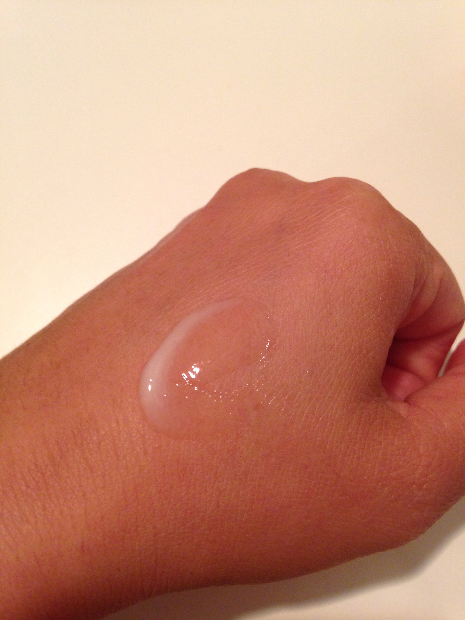 Here’s the texture: kind of a translucent cream. Looks…like…something…ahem. Anyway, it goes on smoothly and seems to balance the dryness and oiliness in my combination skin.