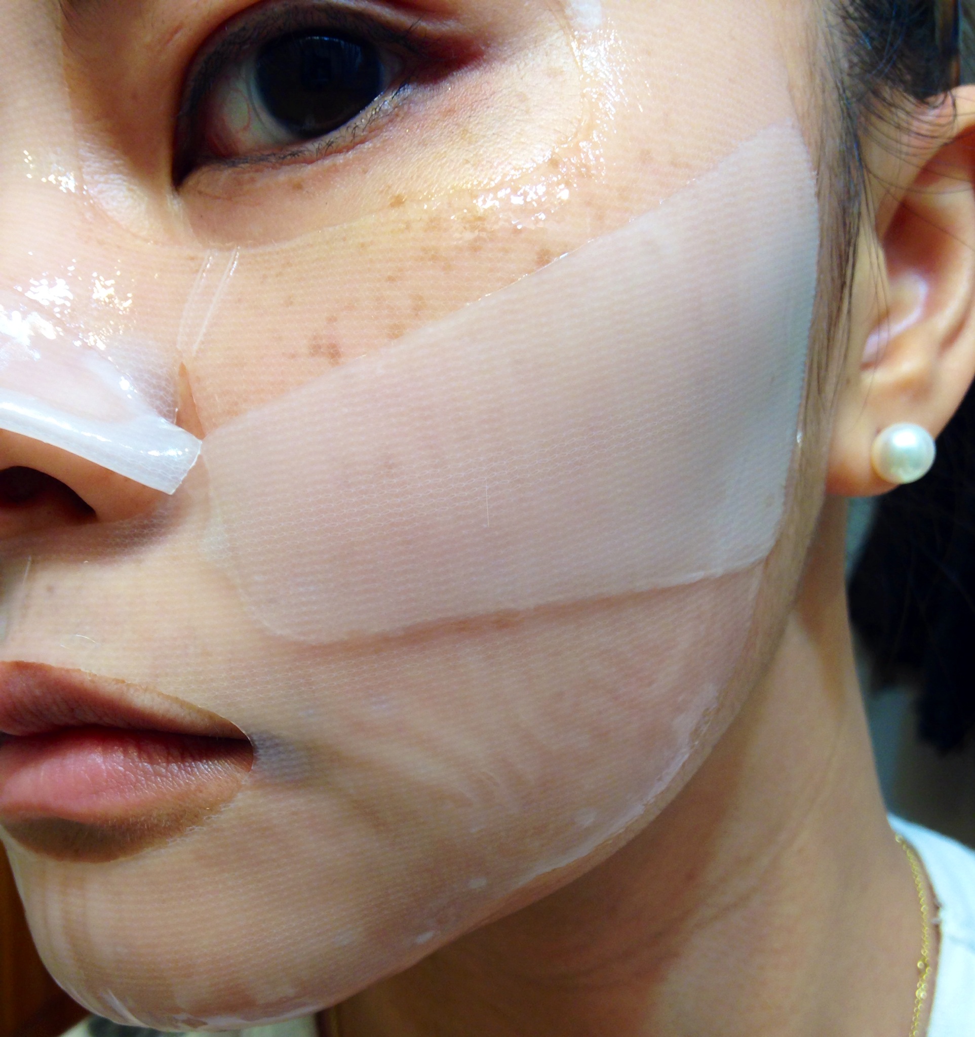 This mask is pretty amazing. Most hydrogel masks are awesome because they hold moisture so much better than paper/cotton sheet masks. They are plump and luxurious and usually come in two separate sections for the top and bottom halves of your face. Because it fits your face perfectly and sticks on like plastic wrap, it seals in moisture and probably helps skin absorb all the good stuff. Behold it in action: