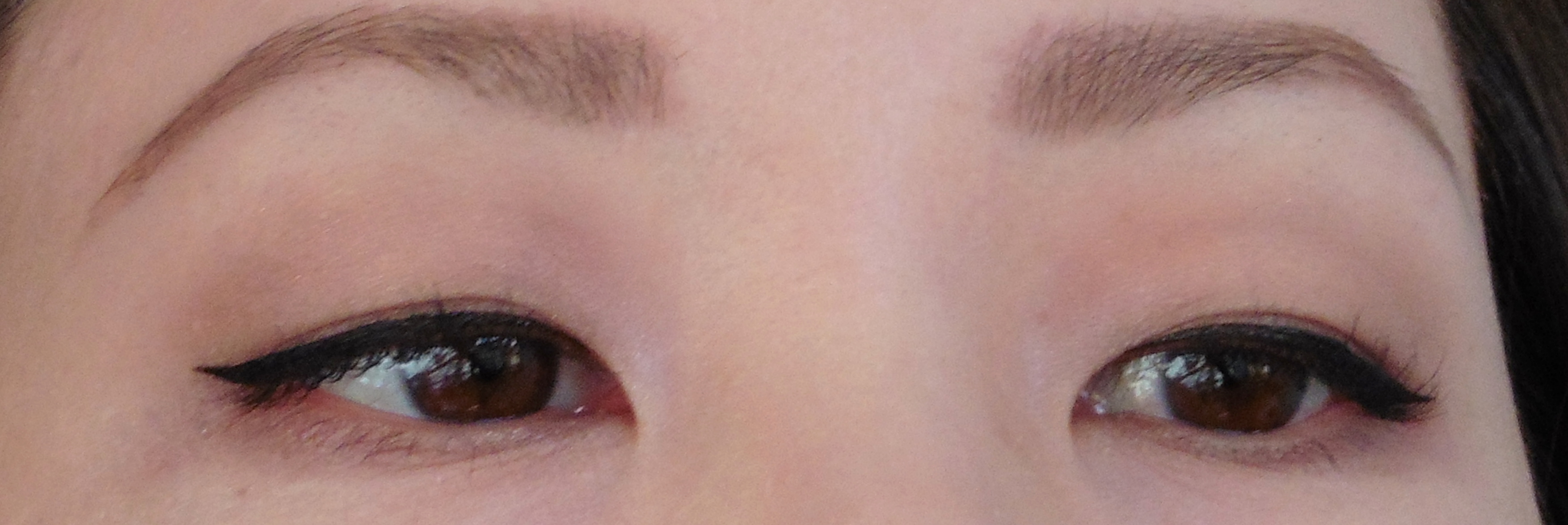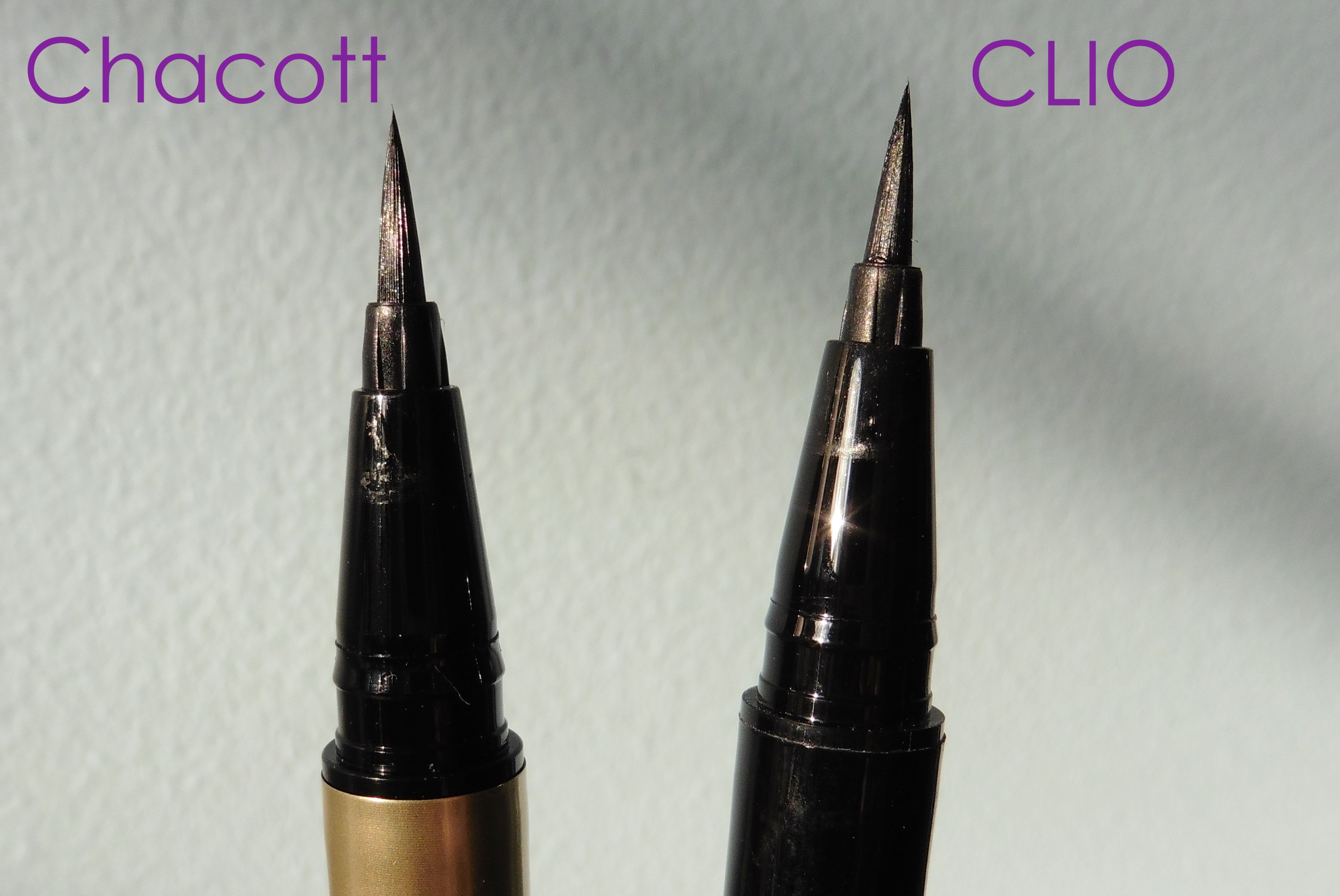 Yet I gravitate towards the Chacott more. Both can draw lines of extremely fine to medium thickness. However, when I use medium pressure, the Chacott draws sliiiightly thicker lines than the CLIO, which–since I tend to draw my eyeliner on pretty thick–means less time spent building up the shape.