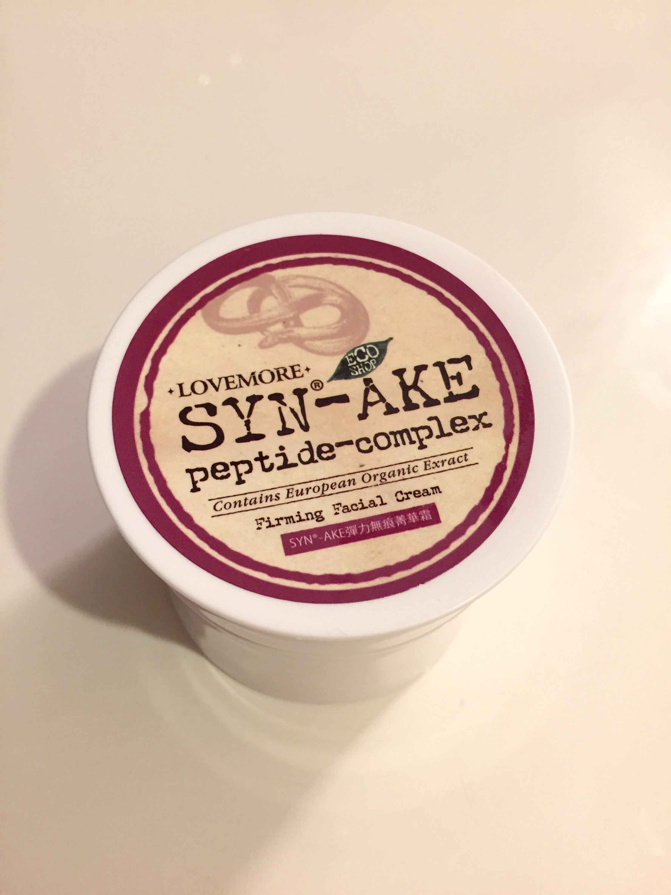 After applying a Lululun mask (special green grapefruit edition,) I slathered this Lovemore Syn-ake all over my face. YES it feels firming, if only temporarily. It smells a bit musky, almost like a soft English leather mixed with a tea rose scent. It’s a very different but rather pleasant scent for a face product. The texture is of a light, bouncy cream, almost like a moisturizing gel but a bit heavier.