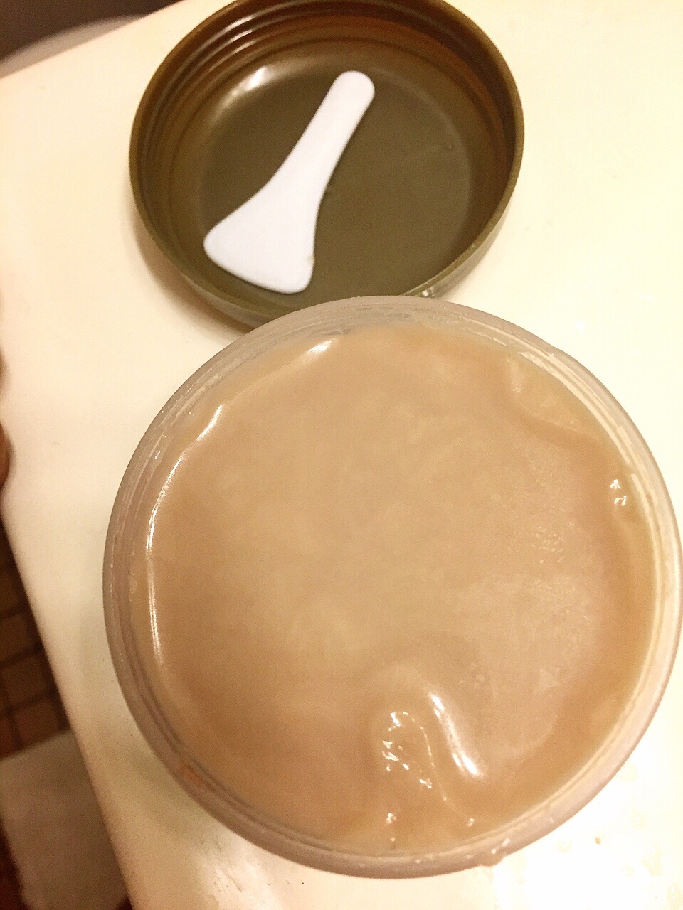 The consistency of the mask is exactly like you’d expect. It’s like a jiggly cross between jello and pudding or flan. It’s a weird gross brownish grayish color like an expired bubble tea but it smells nice (like a new bubble tea.)