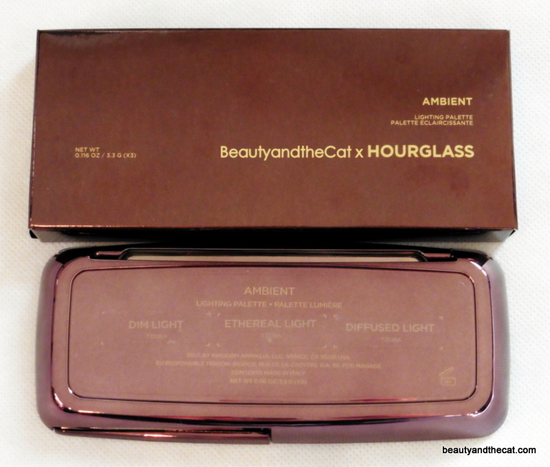 02 BeautyandtheCat x Hourglass Ambient Lighting Palette03 BeautyandtheCat x Hourglass Ambient Lighting PaletteThe BeautyandtheCat x Hourglass palette is a departure from the Ambient Lighting Palette in Hourglass’s permanent line. Although both palettes feature the glowifying Dim Light, the BeautyandtheCat edition omits the bronzing shade Radiant Light in favor of color-correcting Diffused Light and features shine-free Ethereal Light in lieu of the more conventional highlighting shade Incandescent Light.