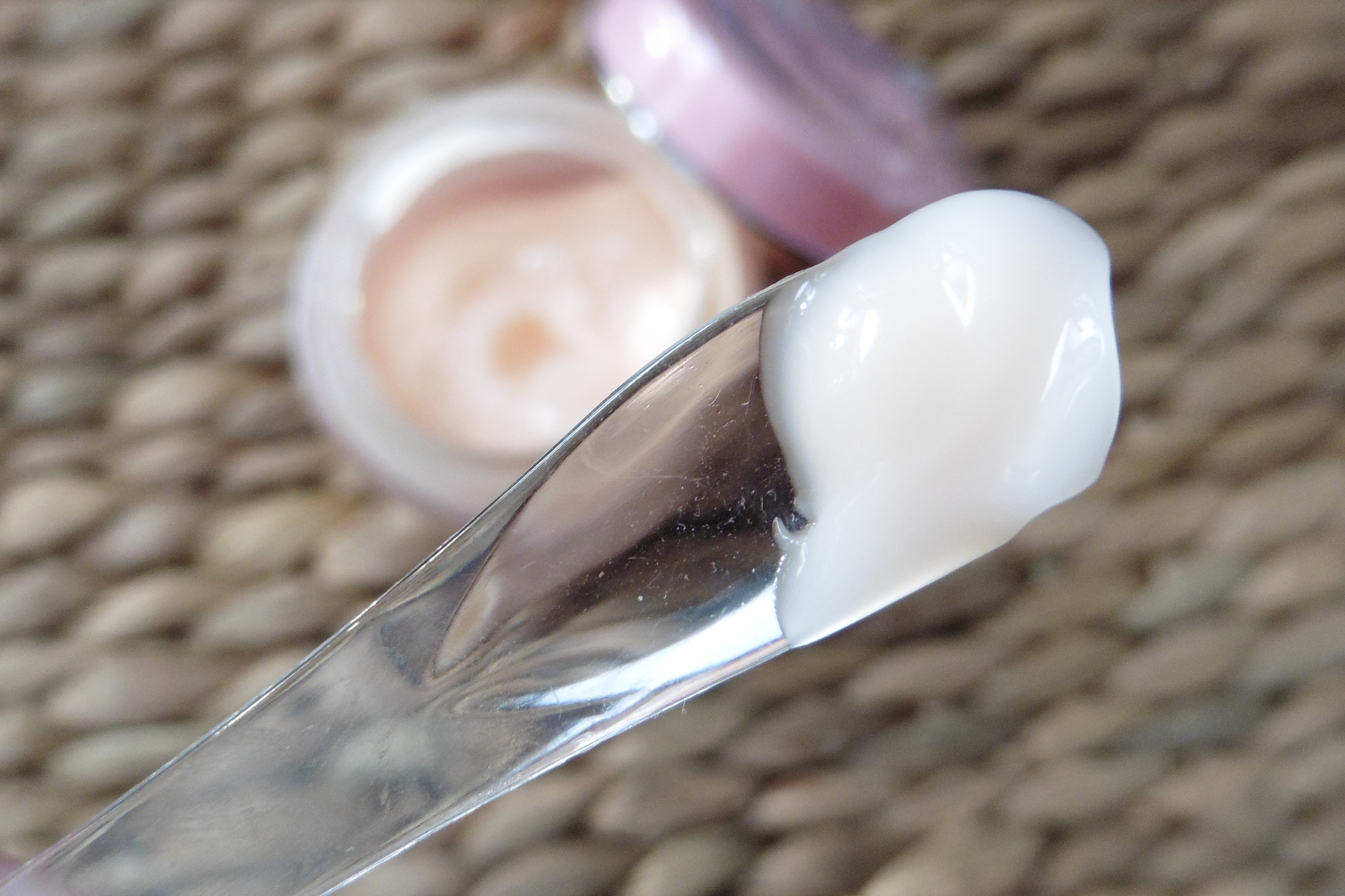 The light pink gel-cream is housed in a wide-mouthed clear glass jar with a plastic lid that is endearingly shaped like a dollop of cream. It comes with a spatula, but I just scoop it out with my fingers.