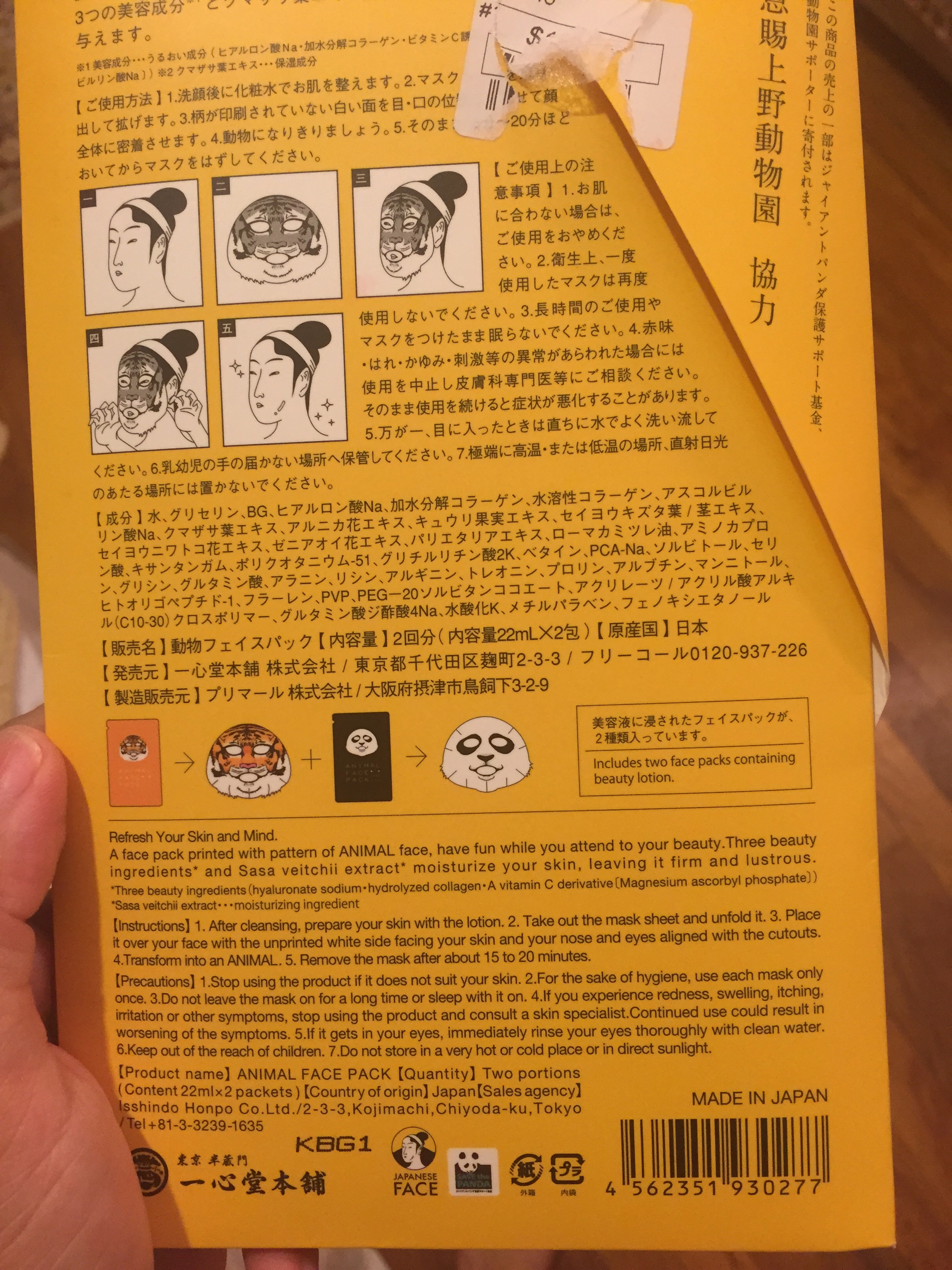 From the bizarre files of Japan skin care comes this sheet mask pack of 2 made with faces of a tiger and a panda from the Ueno Zoo printed on it: