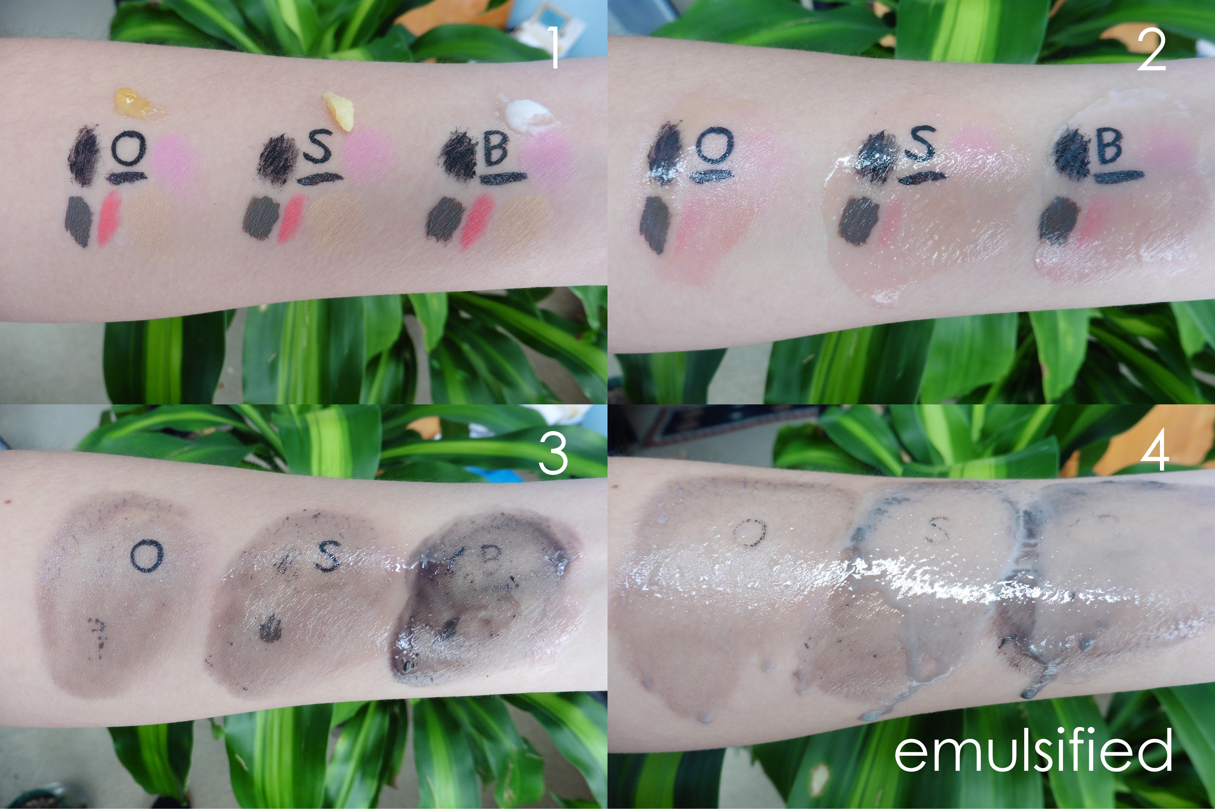 I did a demonstration on my arm using Heroine Make Long & Curl mascara, Chacott liquid eyeliner, a glitter liquid eyeliner by Sephora, Sonia Kashuk brow gel, Heavy Rotation cream blush, a bright Chanel lipstick, and IOPE cushion foundation. (In the emulsification photo, you can see that the su:m37 and Banila Co. turn milky.)
