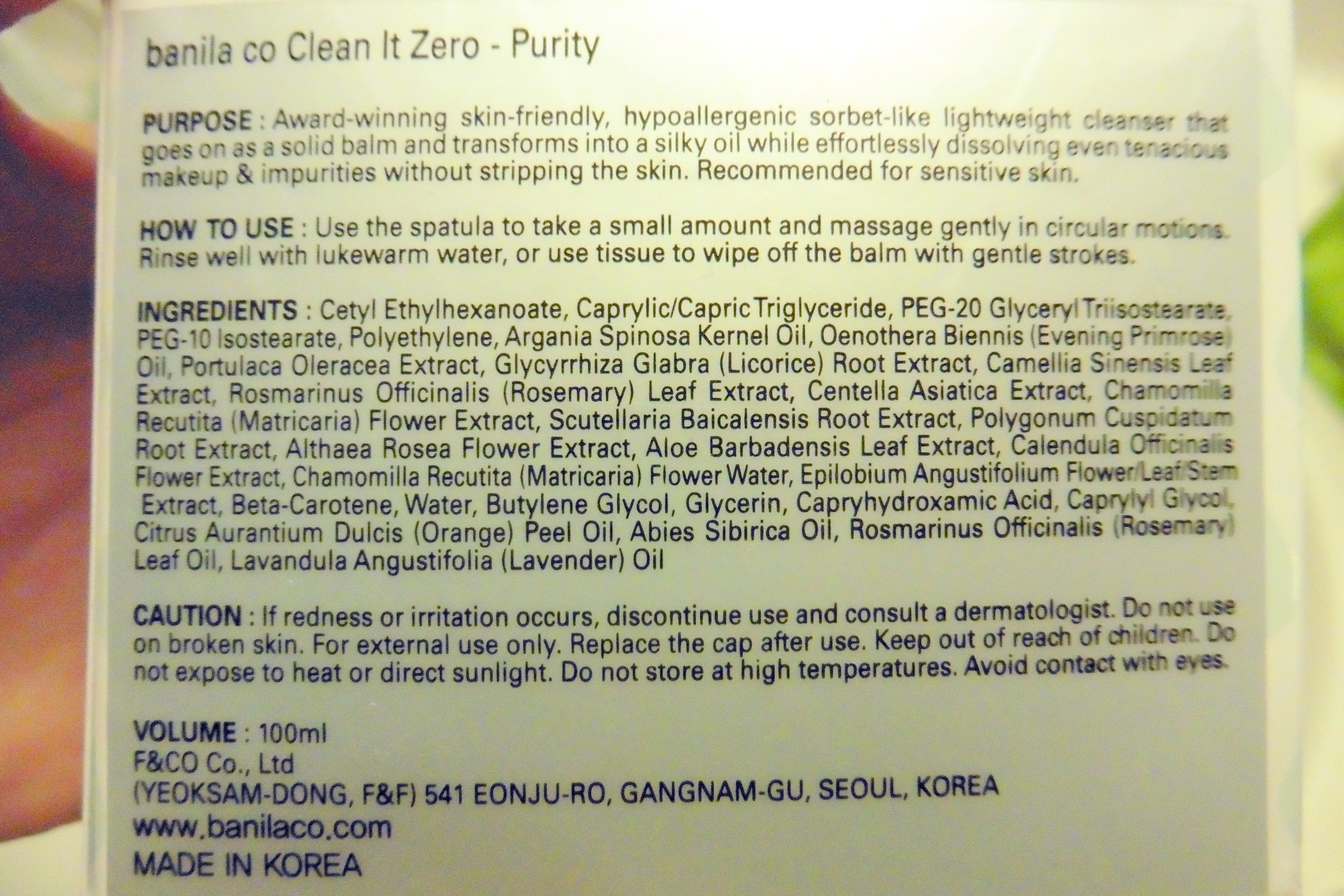 P.S. I won’t pretend that I know how to analyze ingredients, so I’ll just point you to them. The su:m37 ingredients are all in Korean, but Fanserviced translated them here. The Banila Co. and Ole are pictured below (click to enlarge). I do know that the major difference between the Banila Co. Purity version and the original version is that the Purity does not have mineral oil; the Purity also boasts of being free from artificial coloring, synthetic fragrance, alcohol, and parabens.