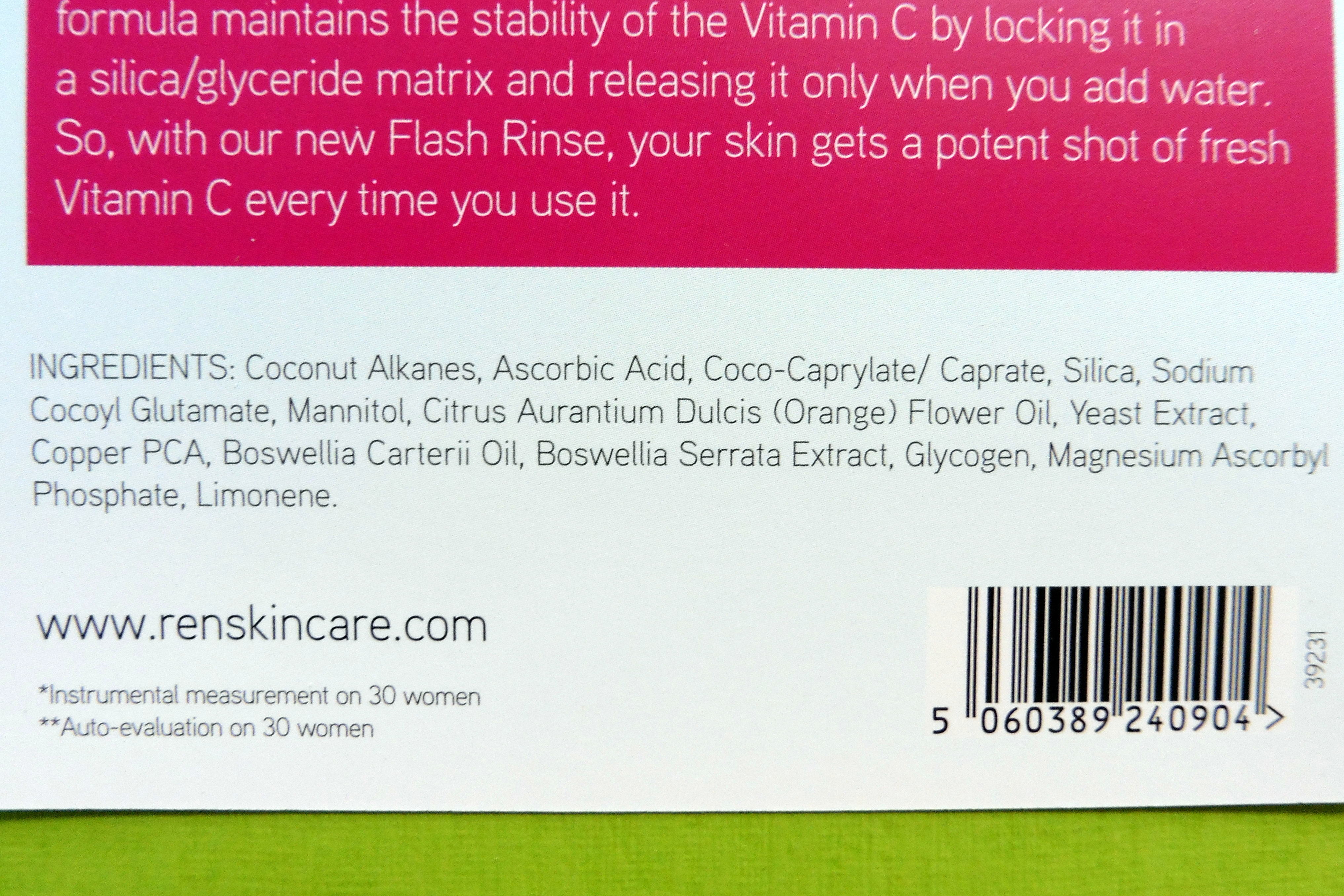 04 REN Flash Rinse 1 Minute Facial IngredientsThe REN Flash Rinse claims to utilize an innovative formula that stabilizes the vitamin C “by locking it in a silica/glyceride matrix and releasing it only when you add water.” Thus, fresh vitamin C in every use.