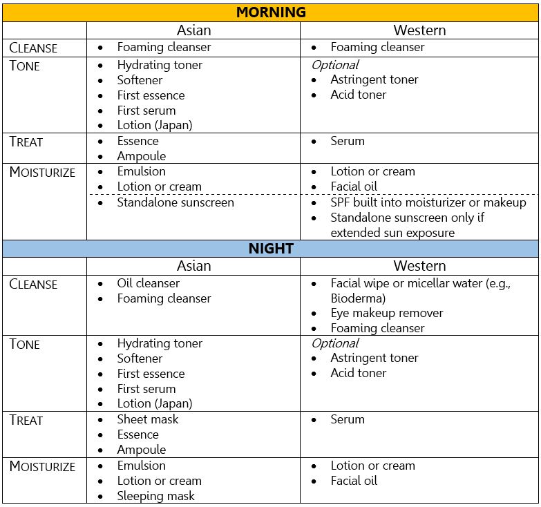 I don’t push for one type of routine over another. Personally, I do a hybrid routine in that it incorporates a lot of (previously) uniquely Asian products such as sleeping masks, but it also includes daily use of acid toners and a retinoid treatment, which are emphasized more heavily in Western skincare (and arguably reflective of different skincare philosophies, e.g., hydrate and nurture vs. strip and renew).