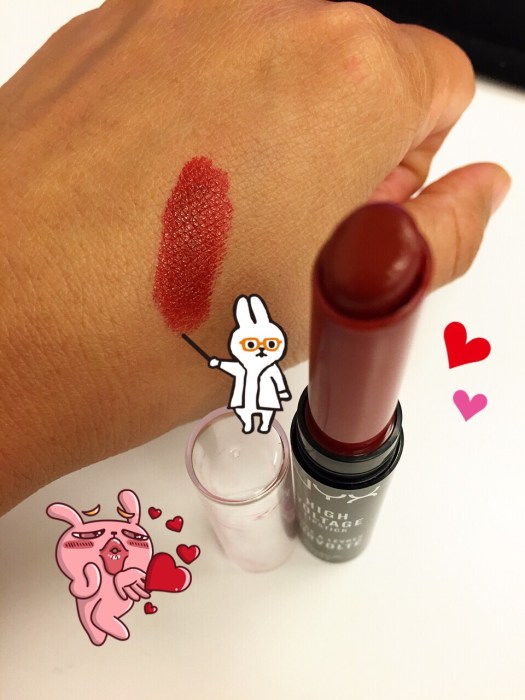 From the free files graciously donated to us by NYX Cosmetics comes this lippie. I didn’t think much of it because it looked like a dark reddish brown in the tube. But I was feeling in the mood to #shopyourstash, so I grabbed it: The High Voltage Lipstick in Burlesque