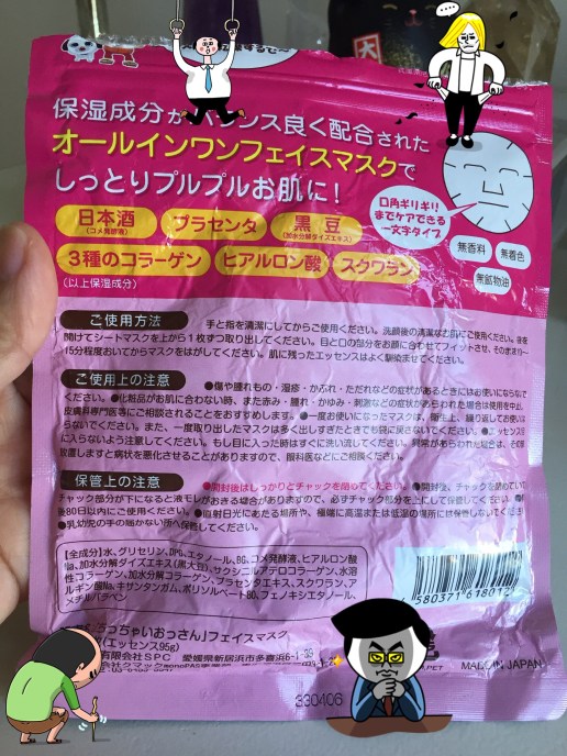 Wrong. None of the above. So I can gather from the bottom right hand corner there’s sake and horse oil or donkey milk in the sheet mask. And then there’s black stones and a water droplet so one can only derive that there are instructions on how to skip rocks over a pond. But I can’t read Japanese.