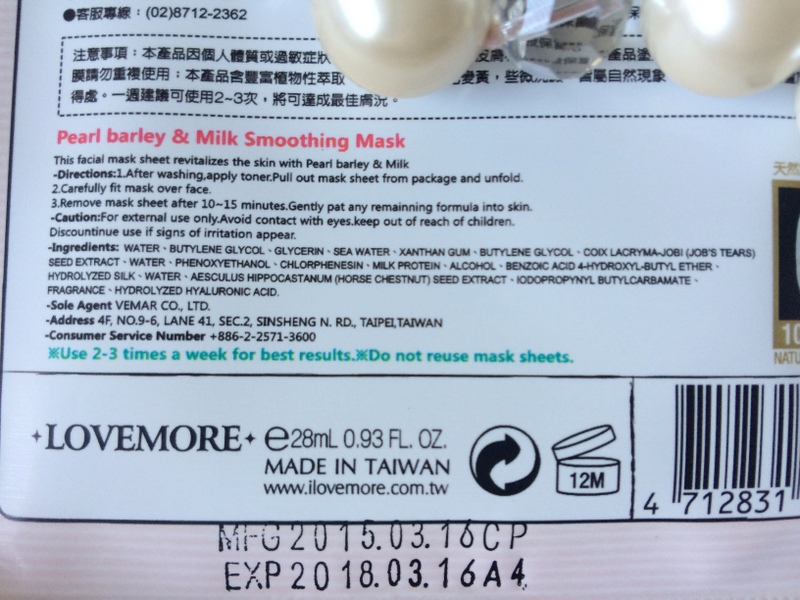 So what about results? Although the fragrance is lighter than Black Pearls (I notice a powder scent only when sticking my nose in the package), Black Pearls produced better effects. Pearl Barley & Milk’s effects were not as strong: plumped-up forehead lines were back to normal by the time I put on makeup 30 minutes later, and the brightening effect took away some morning sallowness but was otherwise mild.