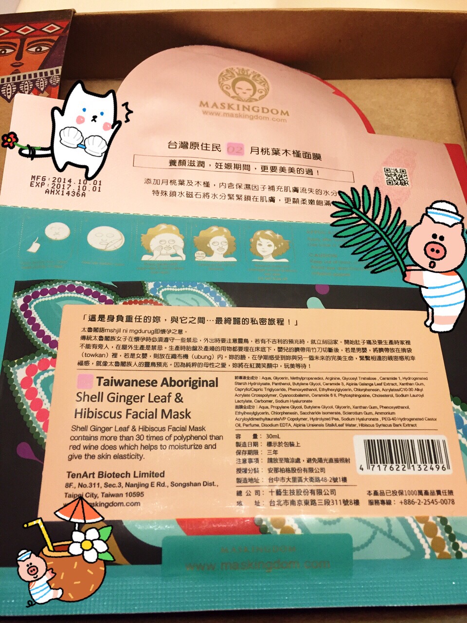 From the hauls of Vivian’s Asian airports comes this Maskingdom boxed set of Taiwanese Aboriginal masks. It has awesome unique natural ingredients (like the below Shell Ginger Leaf & Hibiscus) and bomb designs that make me squee! But is that its only crowning achievement? (har har har)
