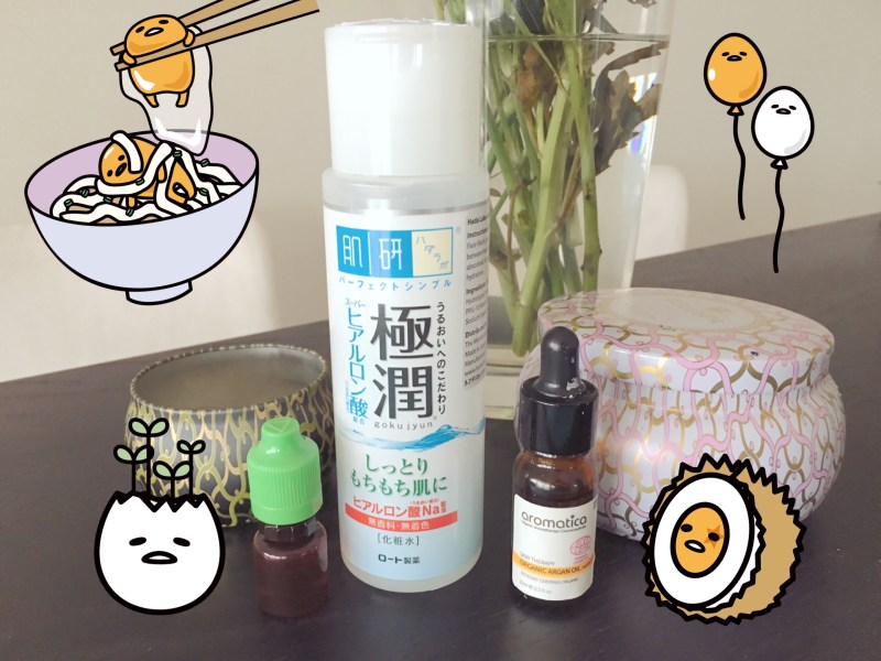 As I mentioned in my review of Sonia Kashuk’s retinol oil, mixing a hydrating toner such as Hada Labo Gokujyun Lotion with 2-3 drops of facial oil creates a runny, slippery, moisturizing liquid. Richer and glowier than the toner alone, more spreadable and less greasy than oil alone. Thanks to Kinseng for the idea.