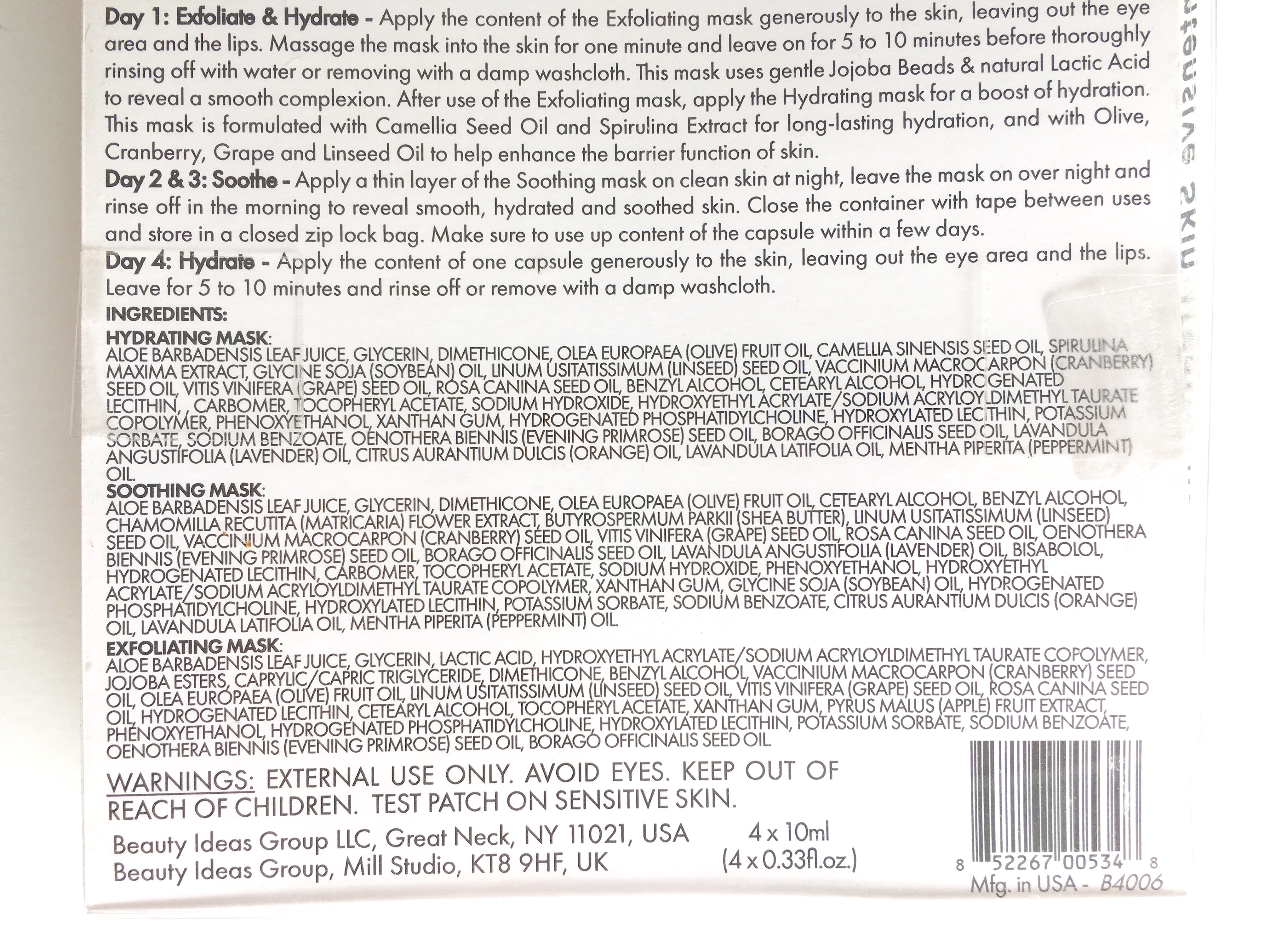 They’re sold separately ($9.87 for 3) and in this 4-pack marketed as a 4-day regime for dry skin ($12.99).  There’s 10 ml/0.33 fl. oz. in each pod, which easily covers 2 to 3 uses.  Just cover it back up after each time.  Nügg advises using up the leftovers within 2 days, although the mask showed no signs of drying out even after 4 days.
