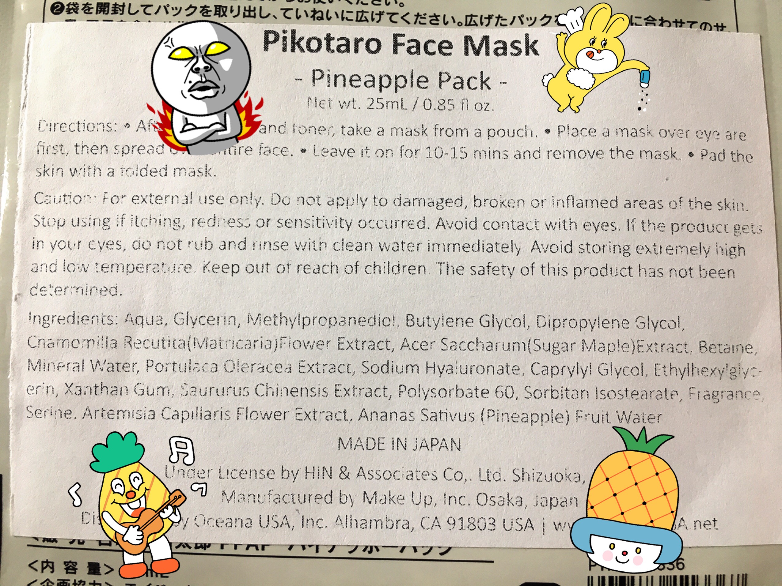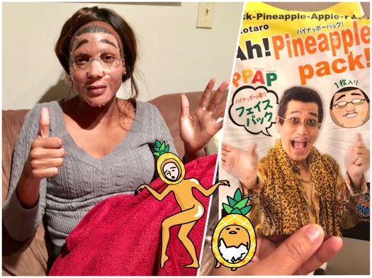Angela: I’m going to pretend you didn’t just wound the deepest part of my soul. Anyhoo, I got each of us a Pen-Pineapple-Apple-Pen (PPAP) sheet mask. You get a PPAP smear, you get a PPAP smear, EVERYONE gets a PPAP smear!
