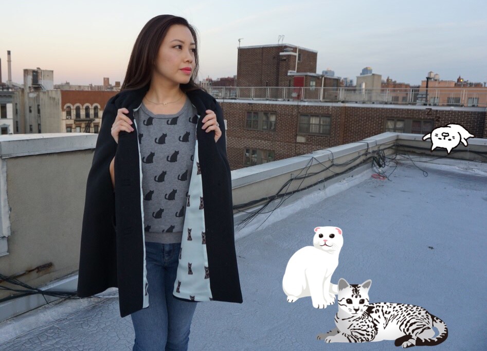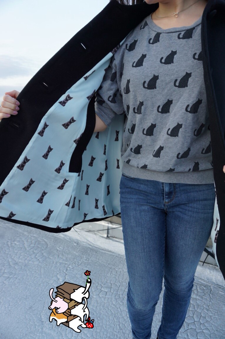 I kept it simple: cat sweatshirt, necklace, and ring. You know, the staples in every woman’s clawset and my go-to outfit for a lazy Caturday. All I was missing was my Paul & Joe Sister bag.