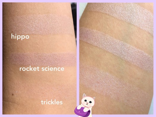 Tl;dr: Trickles was my surprise favorite. I’m keeping Whirl and Swirl as pretty pinks. Giving away Hippo and Rocket Science to the fairer MsMerriam (fellow catless catlady beauty blogger).