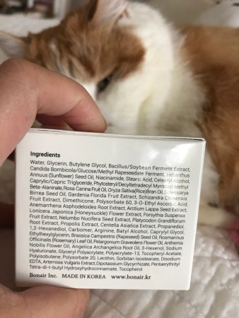 Water, Glycerin, Caprylic/Capric Triglyceride, Bacillus/Soybean Ferment Extract, Butylene Glycol, Tremella Fuciformis (Mushroom) Extract, Stearic Acid, Macadamia Ternifolia Seed Oil, Cetearyl Alcohol, Glyceryl Stearate, Candida Bombicola/Glucose/Methyl Rapeseedate Ferment, Helianthus Annuus (Sunflower) Seed Oil, Hydrogenated Lecithin, Phytosteryl/ Decyltetradecyl Myristoyl Methyl Beta-Alaninate, Sclerocarya Birrea Seed Oil, Oryza Sativa (Rice) Bran Oil, Tanacetum Annuum Flower Oil, Batyl Alcohol, Butyrospermum Parkii (Shea) Butter, Dimethicone, Sorbitan Stearate, Guaiazulene, Anemarrhena Asphodeloides Root Extract, Arctium Lappa Seed Extract, Lonicera Japonica (Honeysuckle) Flower Extract, Forsythia Suspensa Fruit Extract, Nelumbo Nucifera Seed Extract, Platycodon Grandiflorum Root Extract, Propolis Extract, Centella Asiatica Extract, Propanediol, Caprylyl Glycol, Ethylhexylglycerin, Artemisia Vulgaris Extract, Carbomer, Arginine, 1,2-Hexanediol, Brassica Campestris (Rapeseed) Seed Oil, Rosmarinus Officinalis (Rosemary) Leaf Oil, Pelargonium Graveolens Flower Oil, Anthemis Nobilis Flower Oil, Angelica Archangelica Root Oil, 3-Hexenol, Tocopheryl Acetate, Lecithin, Dipotassium Glycyrrhizate, Ceramide NP, Adenosine, Sodium Hyaluronate, Disodium EDTA, Pentaerythrityl Tetra-di-t-butyl Hydroxyhydrocinnamate, Tocopherol