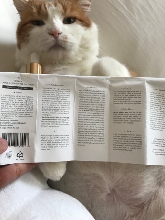Renee: Rose Illuminator Oil Drop is a bi-phase (heh) serum that needs shaking up before using. It’s 30% plant oil and 70% herbal water essence (compared to Angela’s blue oil, which is pretty much all oil).