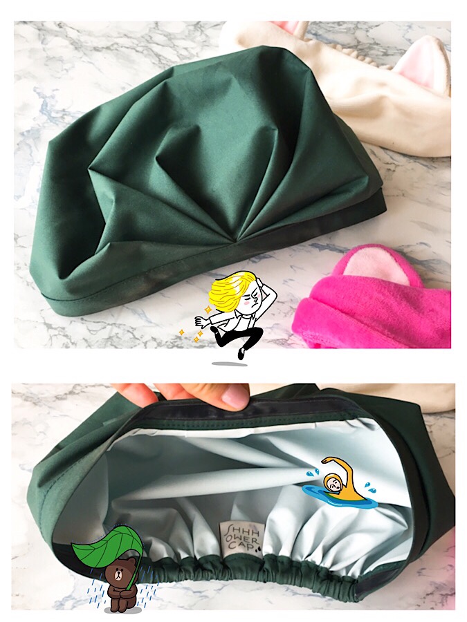 I’ve always been a showercap person (sorry, Etude House cat headbands!), wearing one from the time I wash my face and shower through putting on my makeup. So I’m very familiar with all their annoyances: elastic marks on hair and skin, plastic smell, loosening elastic, leaks, sweaty greenhouse effect…BLERGH.