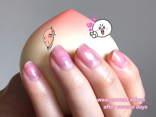 • Durability: Both last about 4 days before showing wear at the tips and cuticles. Both can also start to fade and look yellower/less pink after 4-5 days. I suspect sun/UV exposure hastens the color loss.
