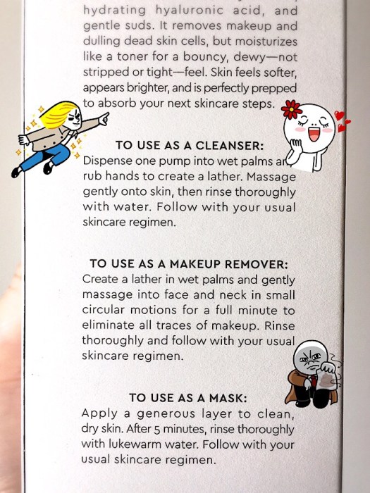 Blueberry Bounce was reformulated in Summer 2018 and this reformulation is the only version I’ve tried. The original did not exactly inspire FOMO, given some reviews about the pH not actually being as low as advertised and the scent being bleachy. Fiddy’s 2017 review of the original covers those points. According to Allure, the reformulation costs the same as the original but contains 60 more ml (yay!) and contains more coconut oil to better dissolve makeup (ha!).