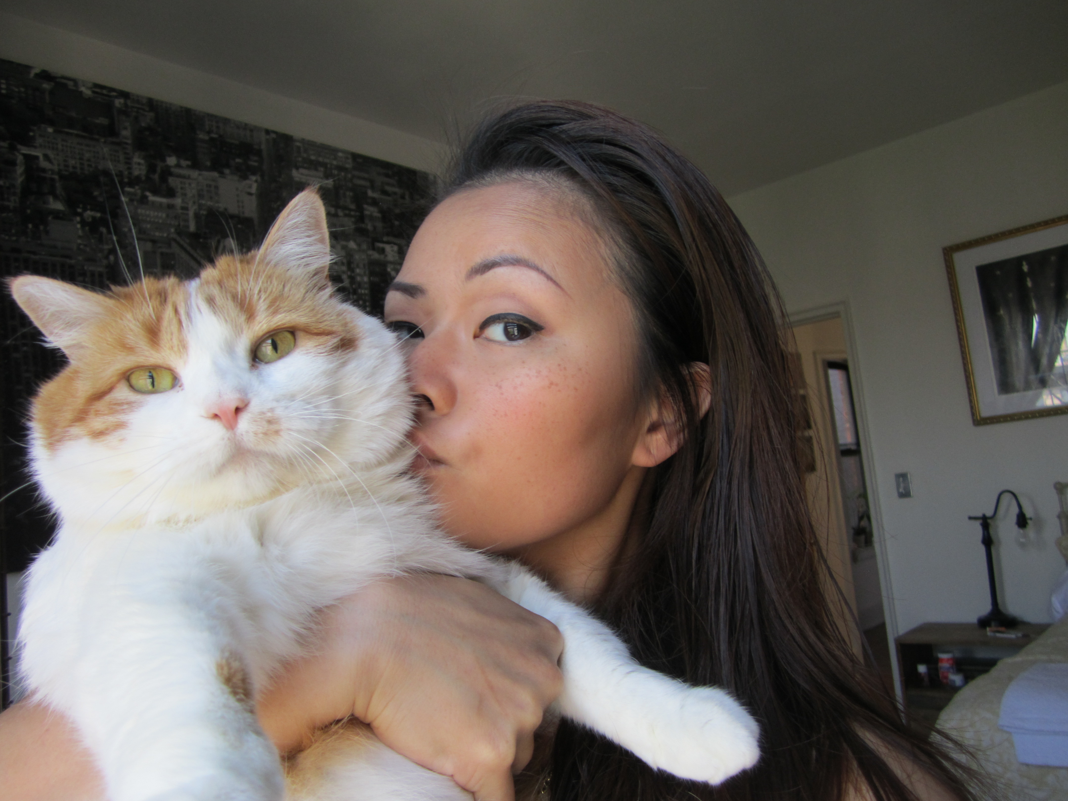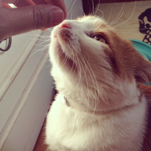 She moved to a foster-turned-permanent home with Renee right before Hurricane Sandy of June 2012. She loves using Renee’s arm as a scratching and nibbling post. She gives a mean side-eye when her favorite meal is late.